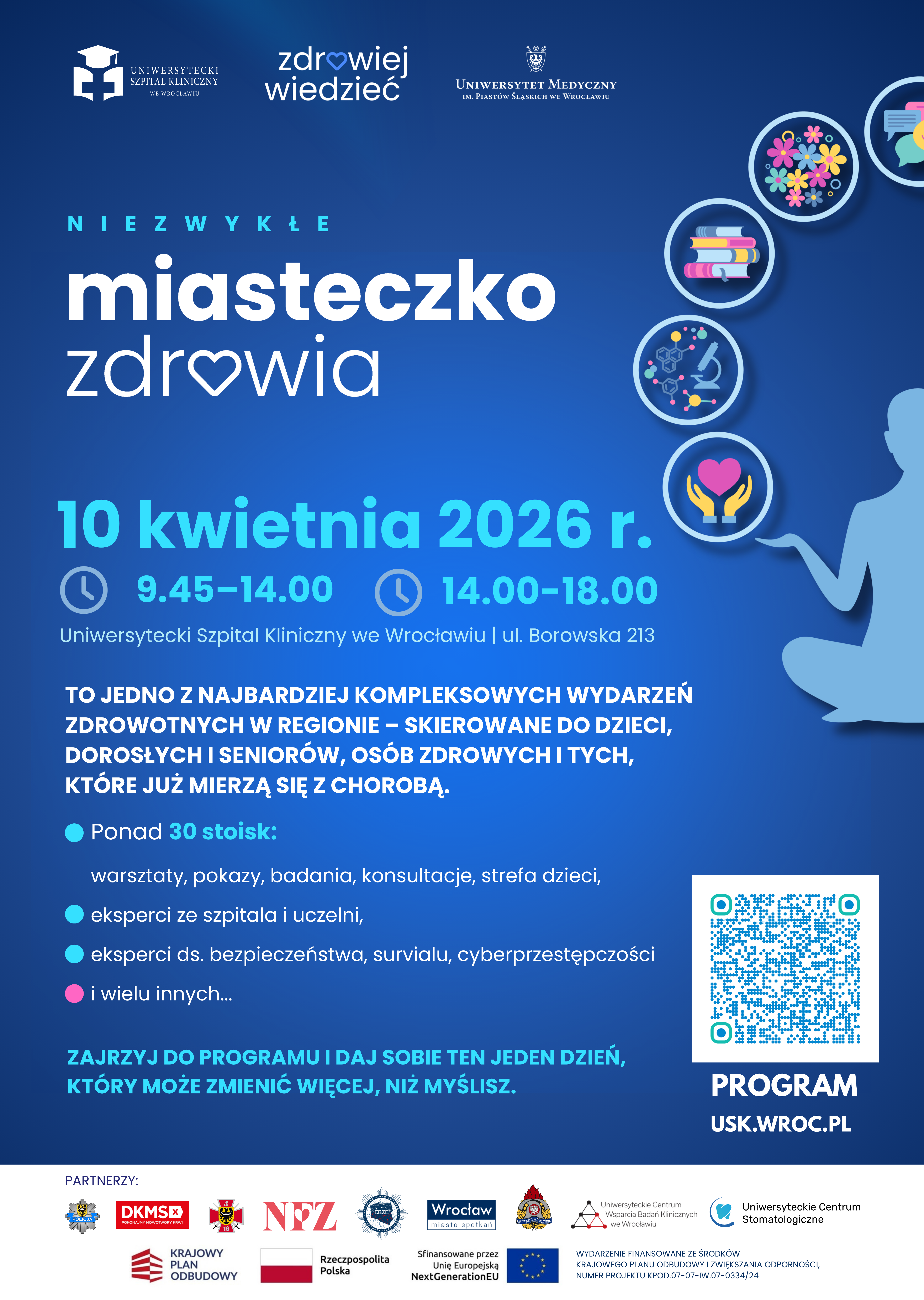 10 kwietnia 2026 roku odbędzie się Miasteczko Zdrowia – otwarte, bezpłatne wydarzenie edukacyjno-profilaktyczne organizowane przez Uniwersytecki Szpital Kliniczny we Wrocławiu (USK) oraz Uniwersytet Medyczny im. Piastów Śląskich we Wrocławiu (UMW). W programie – krótkie prelekcje, praktyczne warsztaty oraz konsultacje z ekspertami. Spotkanie rozpocznie się o godz. 11.00 blokiem wystąpień, a od godz. 14.00 do 18.00 uczestnicy będą mogli korzystać z atrakcji przygotowanych w strefie miasteczka. Wydarzenie jest częścią wspólnej kampanii „Zdrowiej wiedzieć”, realizowanej w 2026 roku przez USK i UMW, której celem jest walka z dezinformacją zdrowotną i upowszechnianie rzetelnej wiedzy medycznej.